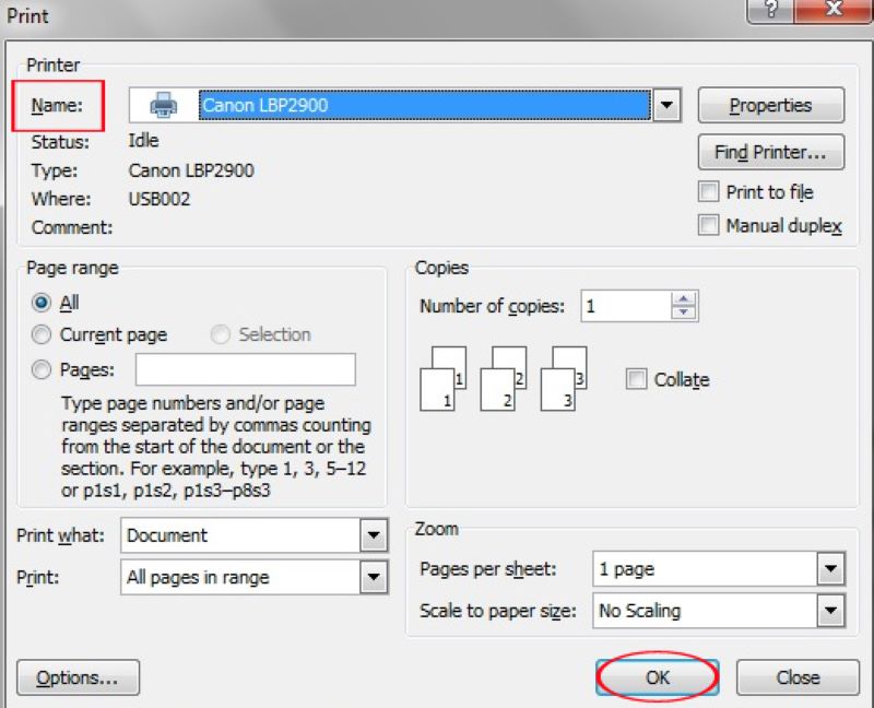 Khi hộp thoại hiện lên lên, tùy theo nhu cầu in ấn mà các bạn có thể sử dụng các tùy chọn. Sau đây là một vài tùy chọn tiêu biểu, cần thiết mà bạn nên quan tâm kèm với cách dùng máy in Canon 2900: